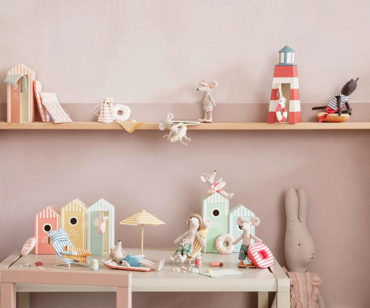 Little Brother Mouse is ready for seaside adventures at the beach. Dressed in striped swim trunks, he comes with his own towel and a round floaty for pretend dips in the water. His box doubles as a cabana or dressing room, making playtime easy to pack up and take wherever the day leads.