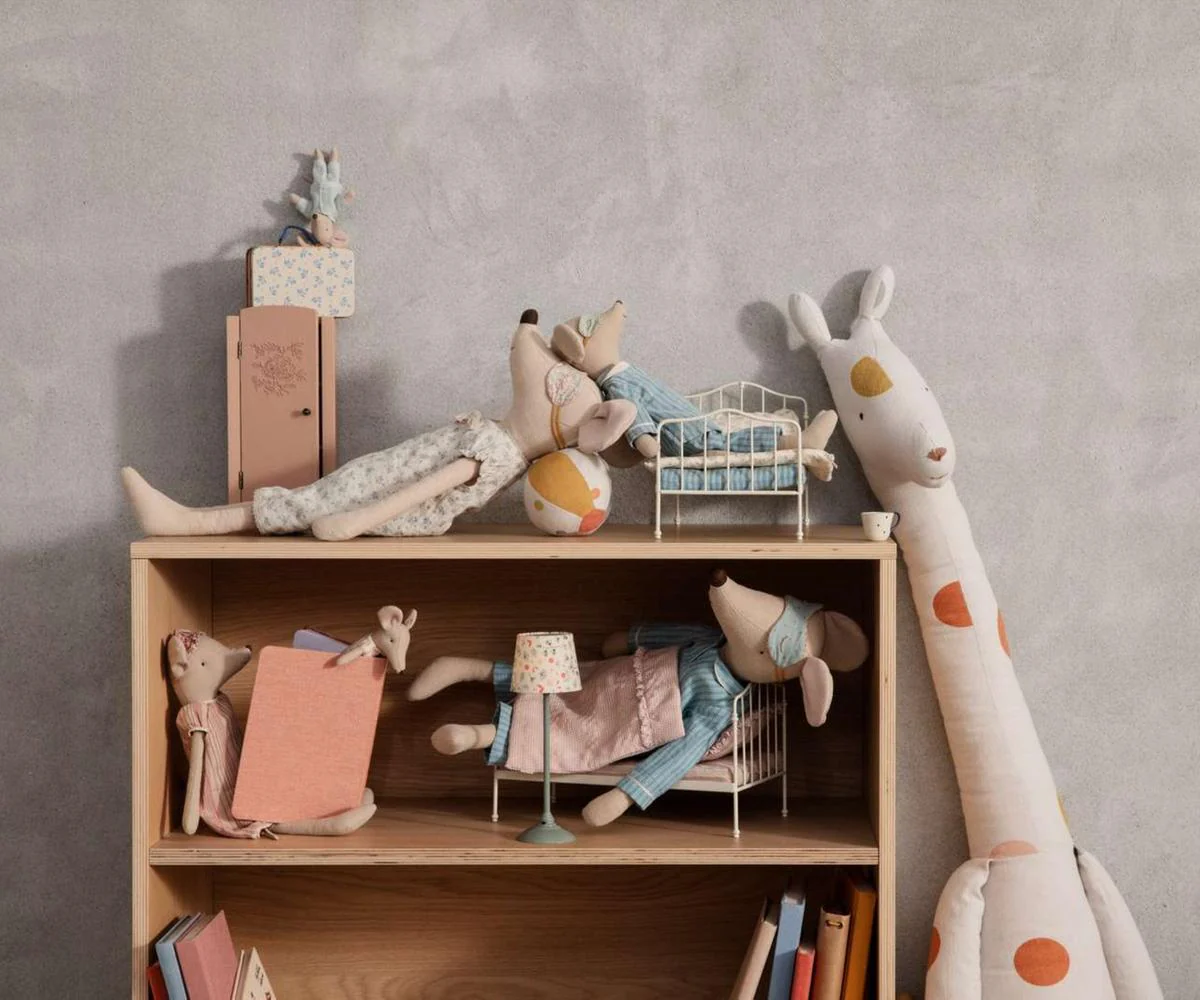 This Maxi Mouse is ready for sweet dreams in his two-piece striped pyjama set. He wears a matching eye mask with sleepy eyes embroidered on, making him the perfect bedtime companion. Soft and cuddly, he is made for cosy snuggles and gentle play, bringing a touch of comfort and charm to every night.