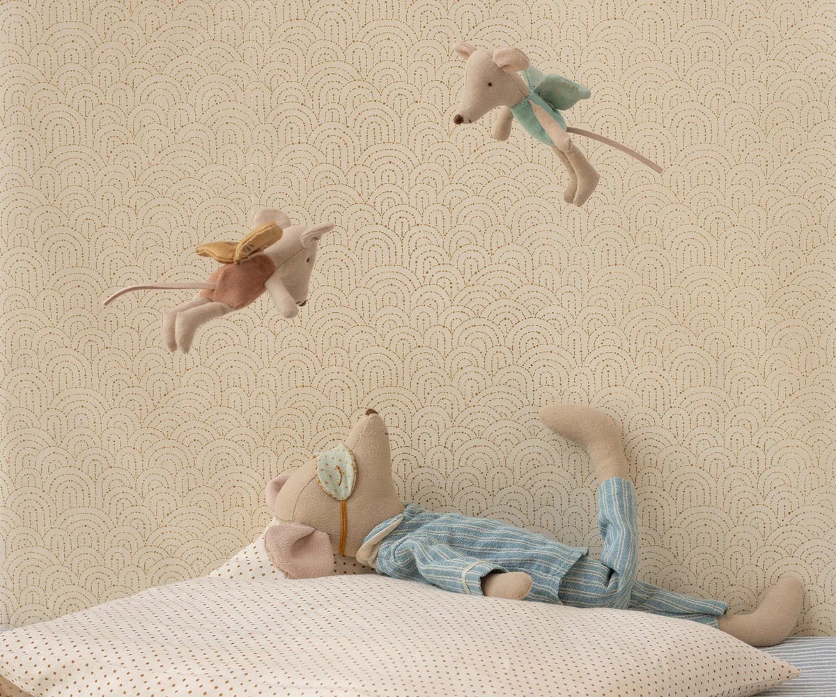This Medium Mouse is ready for sweet dreams in his two-piece striped pyjama set. He wears a spotted eye mask with sleepy eyes embroidered on, making him the perfect bedtime companion. Soft and cuddly, he is made for cosy snuggles and gentle play, bringing a touch of comfort and charm to every night.